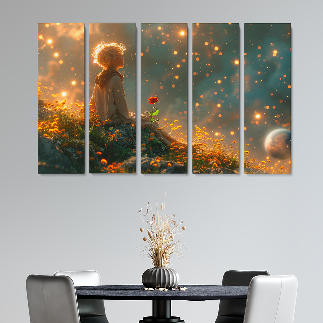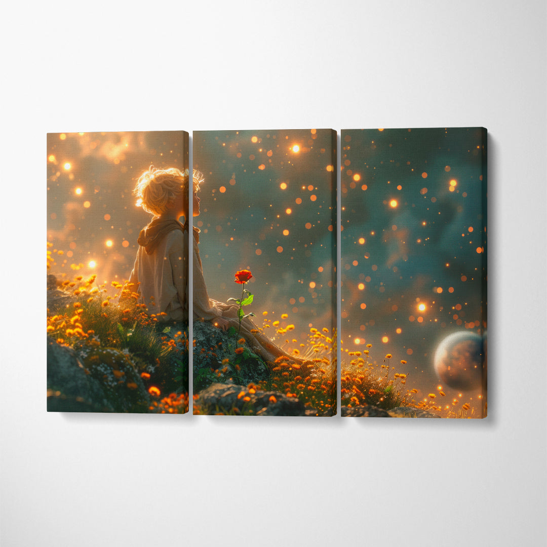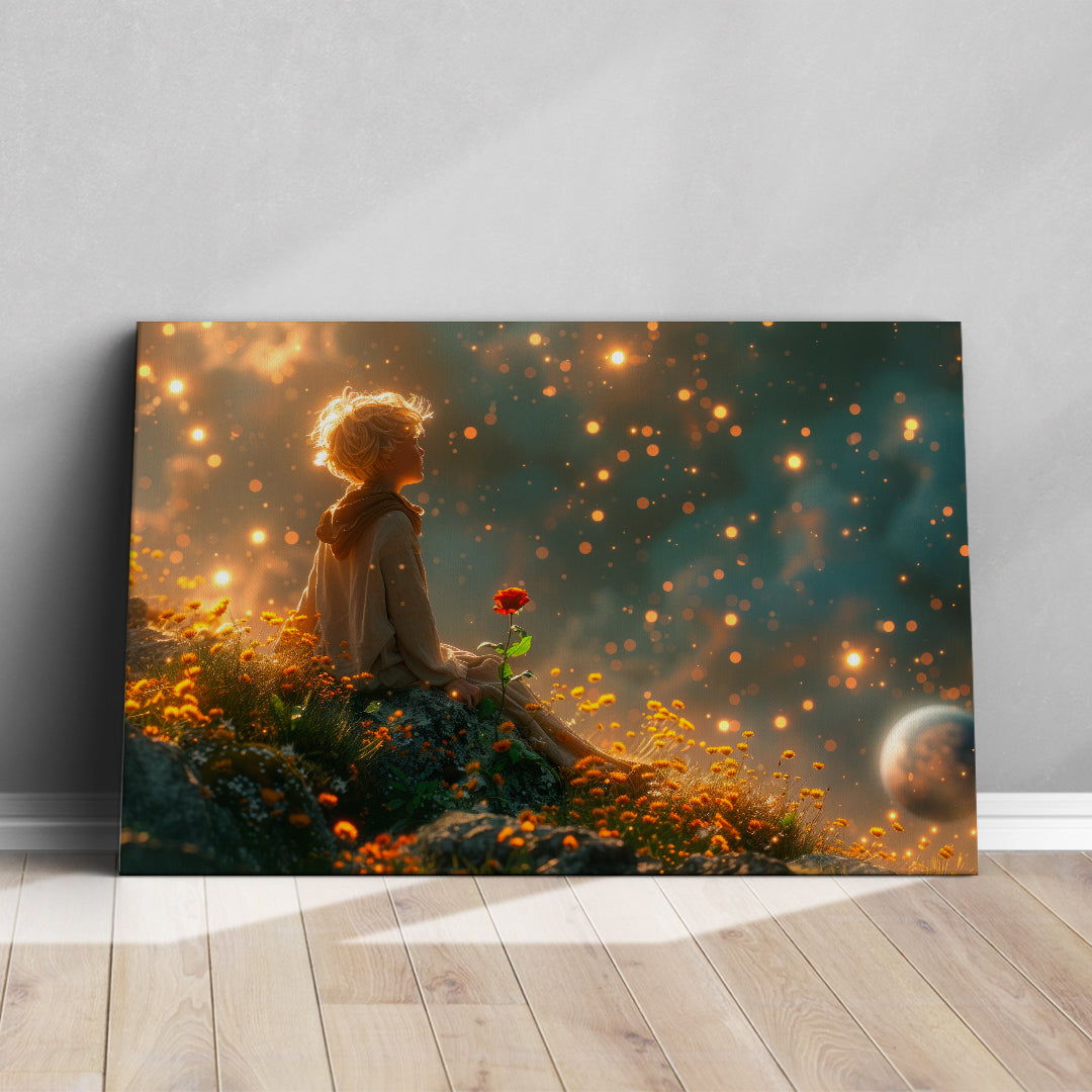 This canvas print features a young dreamer lost in a world of wonder, holding a single rose against a backdrop of magical glimmers. Its enchanting atmosphere is perfect for sparking imagination in a child’s room or adding a touch of whimsy to a cozy reading nook.