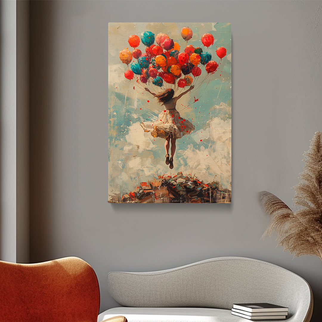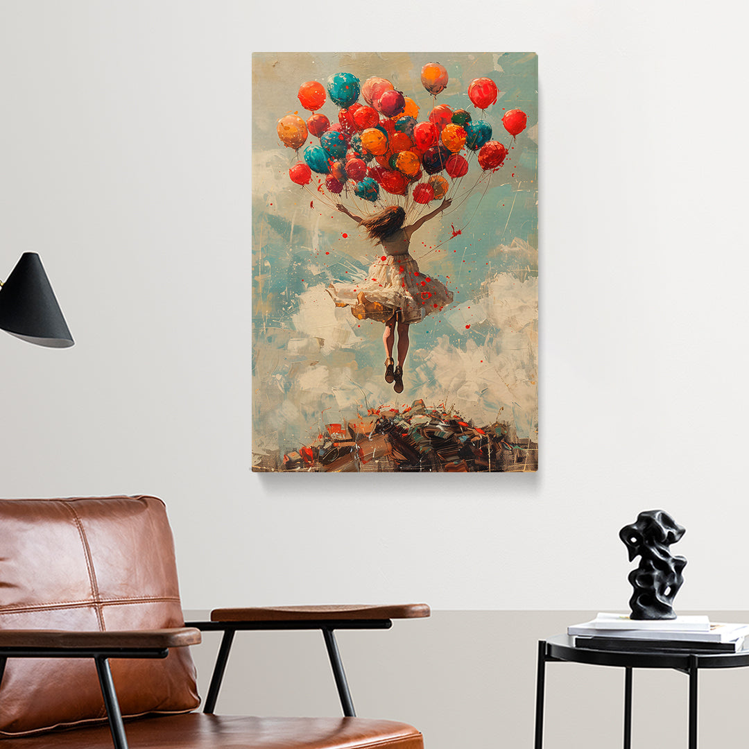 Ignite your imagination with this canvas print that captures the whimsical adventure of a girl taking flight with colorful balloons. Vivid colors and dynamic brush strokes give life to any room, making it an ideal addition to a playroom or as a vibrant splash in a more subdued living space.