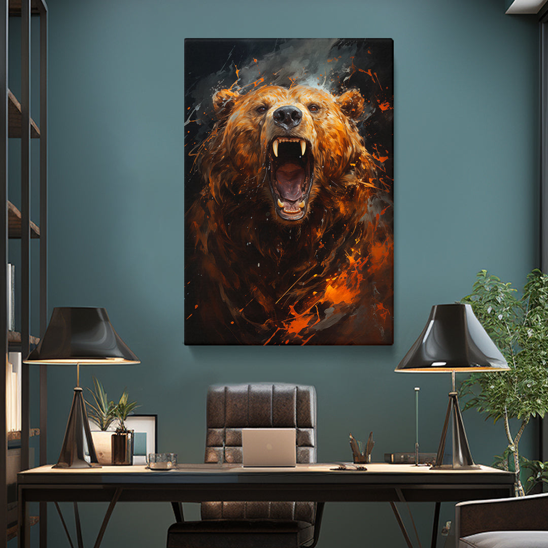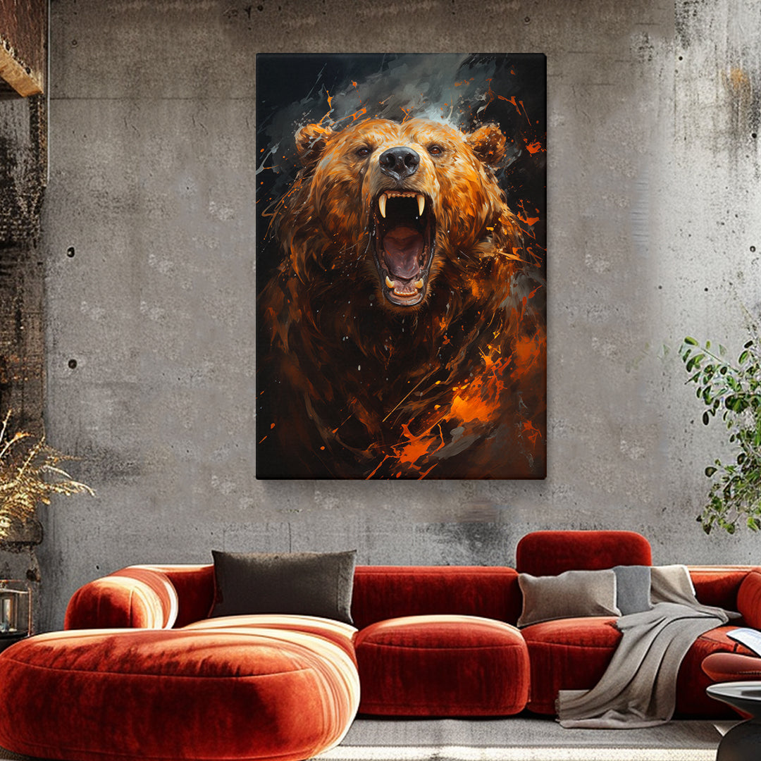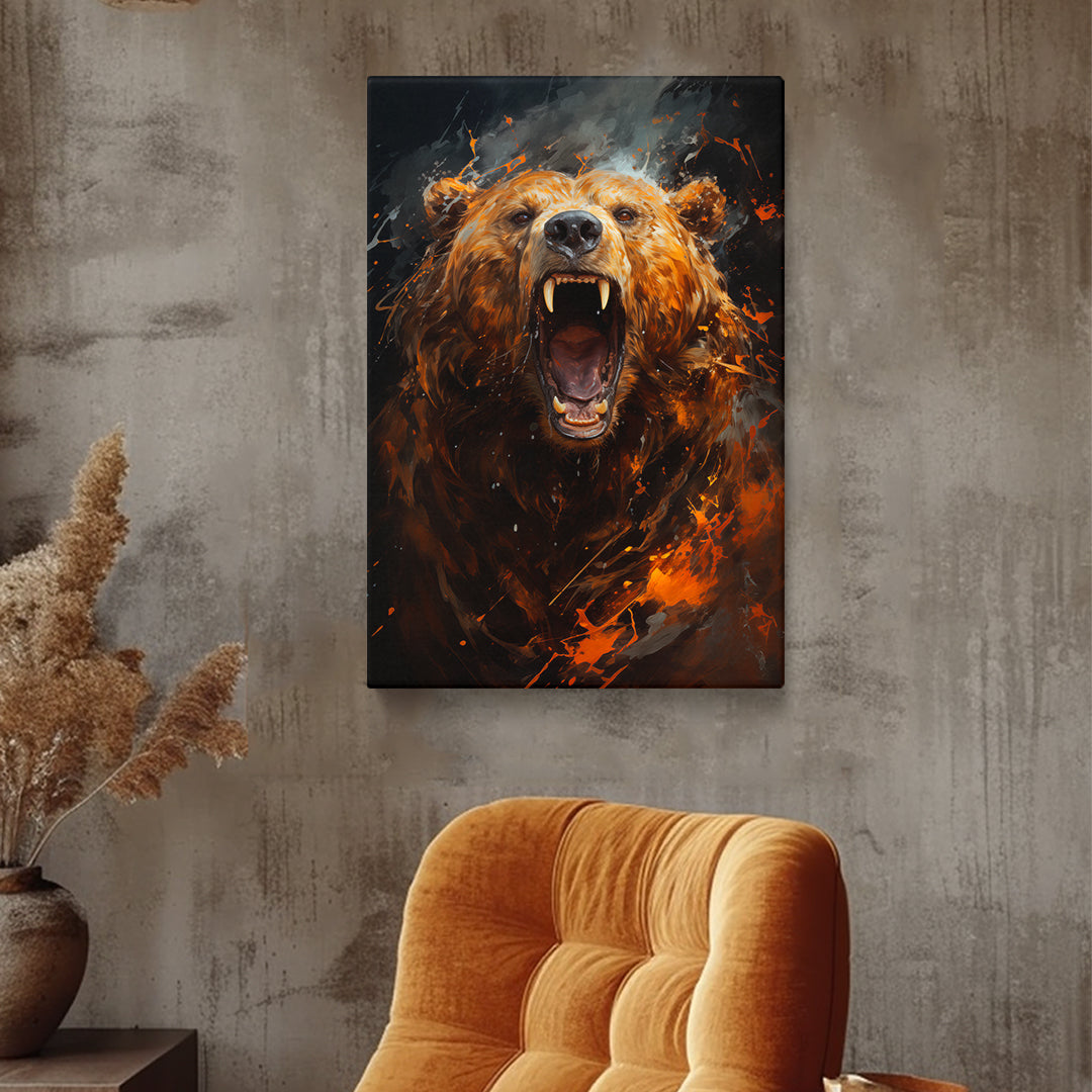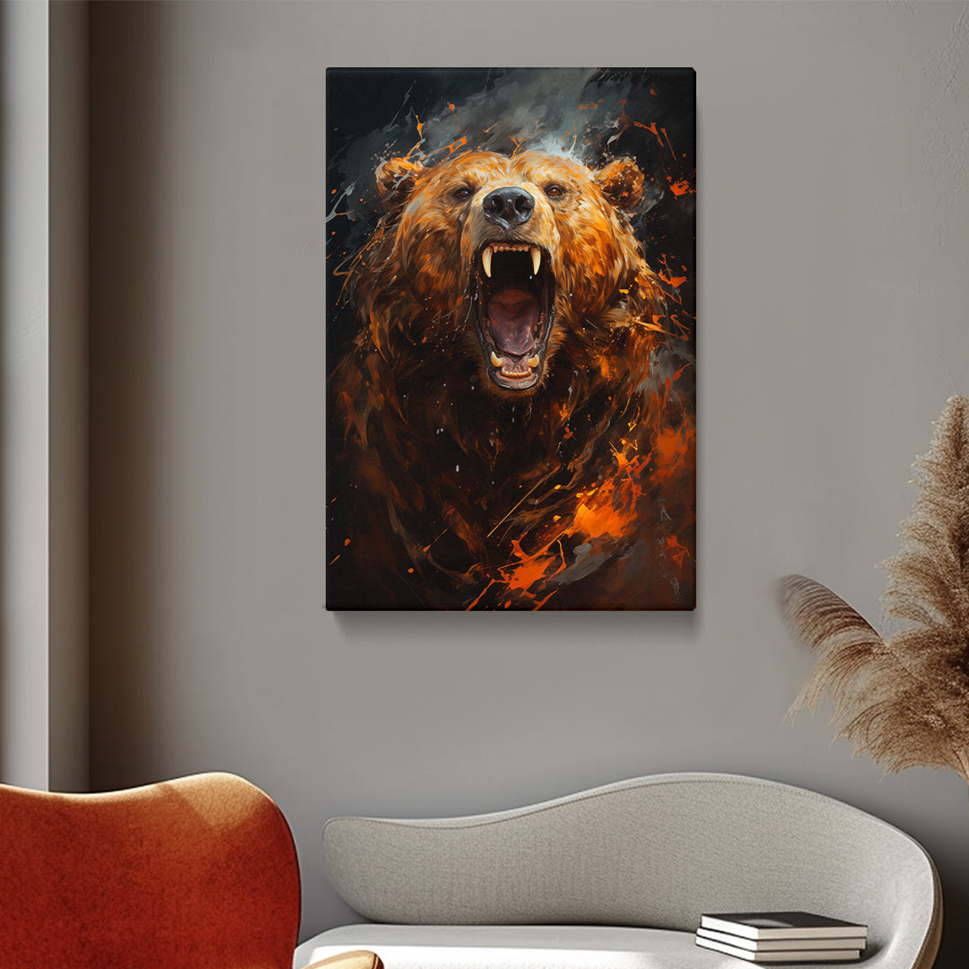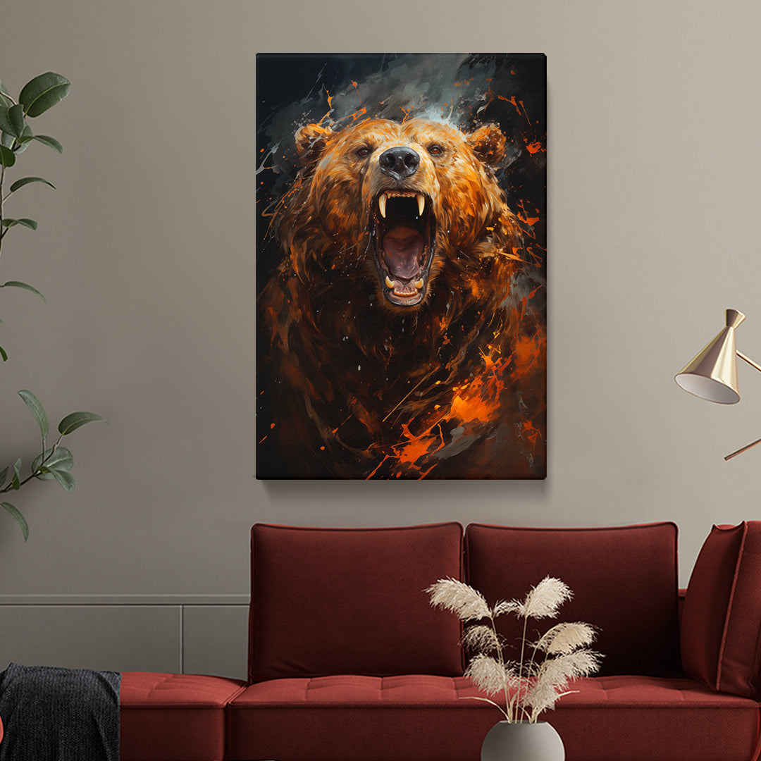 This canvas print embodies the untamed spirit of the wilderness, capturing a bear's roar amidst a turbulent flurry of fiery elements. It's a piece that speaks to the raw power of nature, perfect for adding a dramatic statement to rustic or lodge-themed decor. A compelling choice for spaces that celebrate the wild.