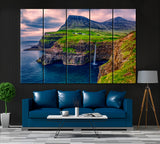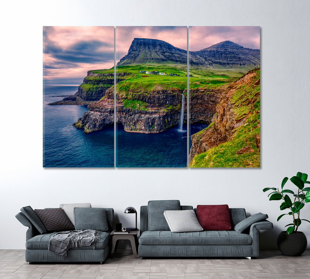 Gasadalur Village with Mulafossur Waterfall Faroe Islands Denmark