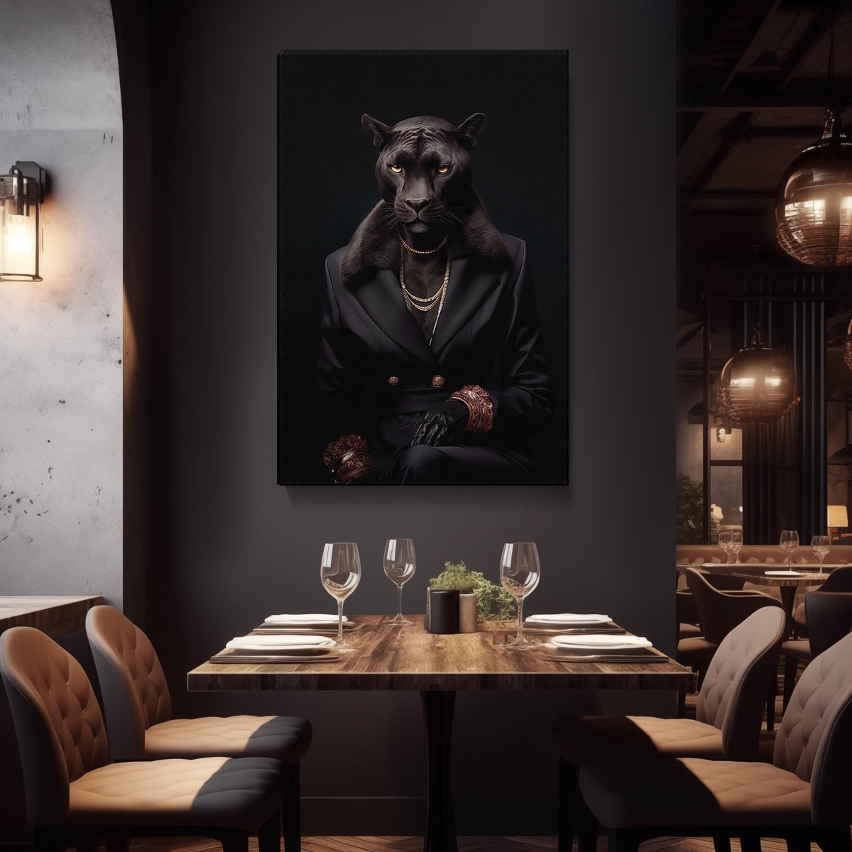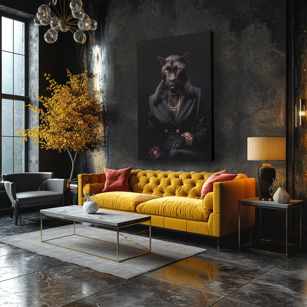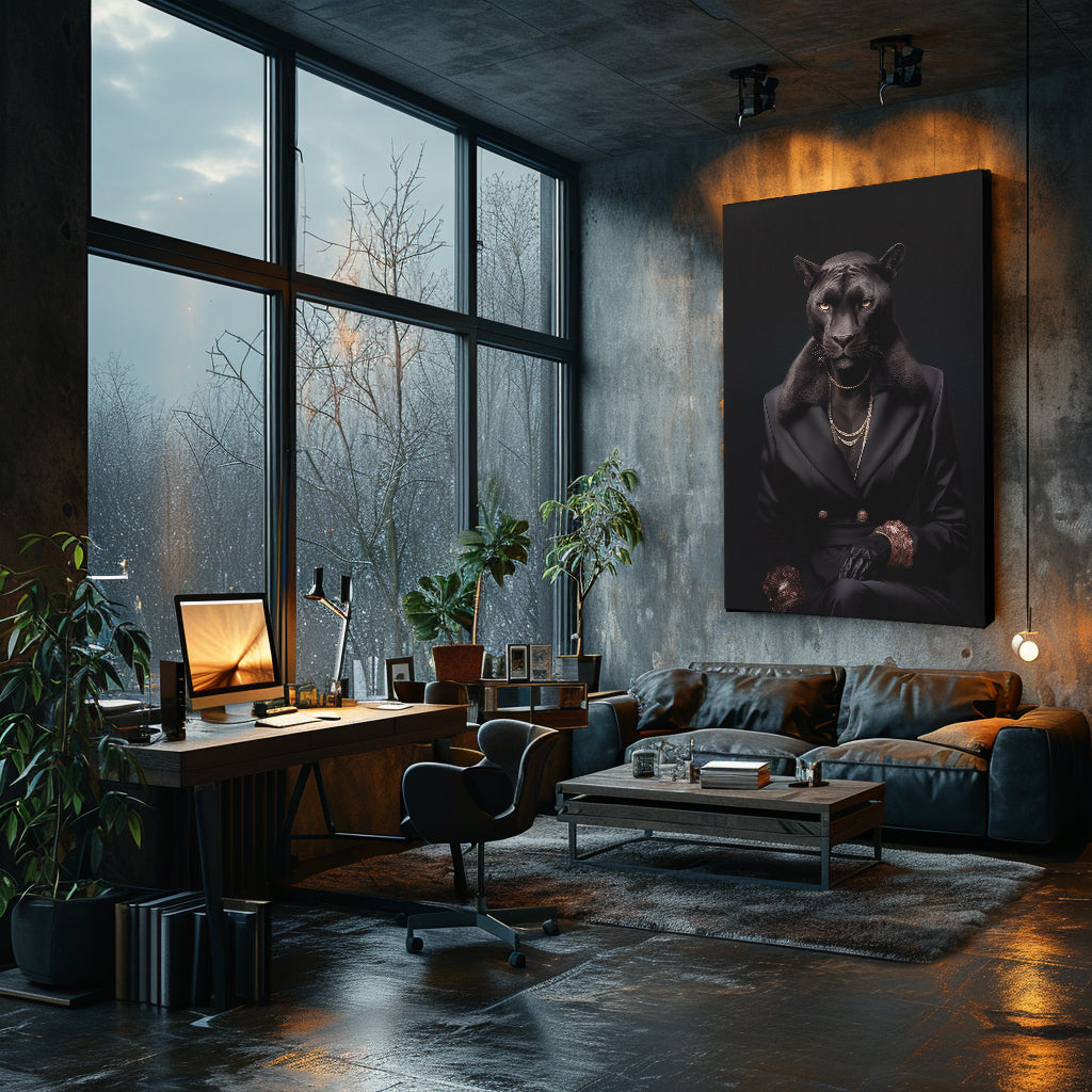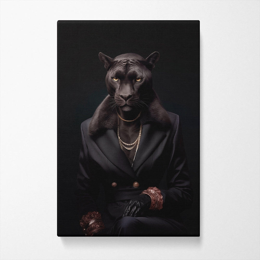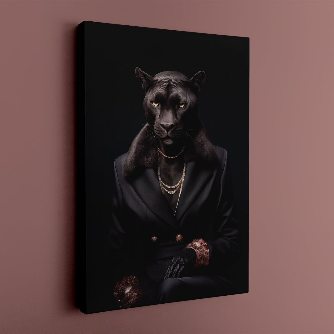Emanate a powerful ambiance in any space with this distinguished panther canvas art. Clad in a tailored black suit with lavish accents, this piece radiates an aura of control and refinement, suitable for a luxurious living room or executive suite.