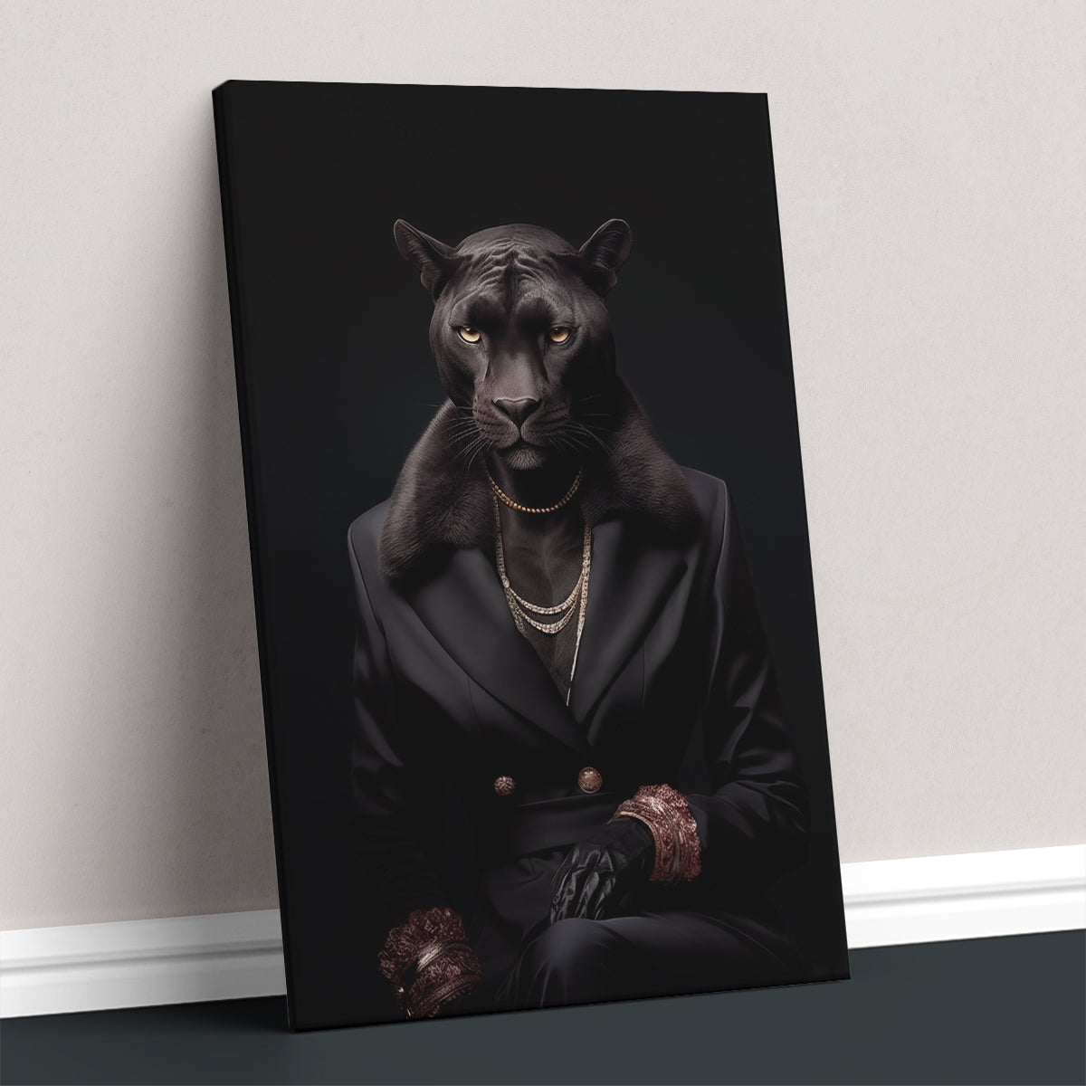 Introduce a sense of majesty to your home office with this sophisticated canvas print, showcasing a panther in a black suit. The luxurious fur cuffs and gold necklaces epitomize opulence, perfect for an individual with a discerning taste in art and decor.