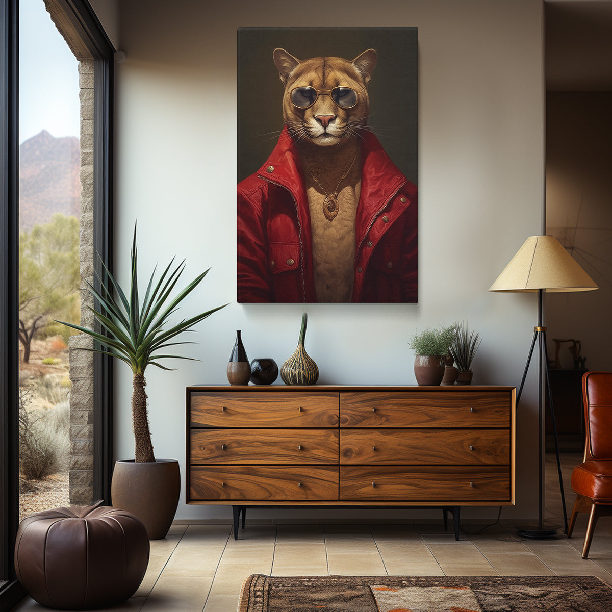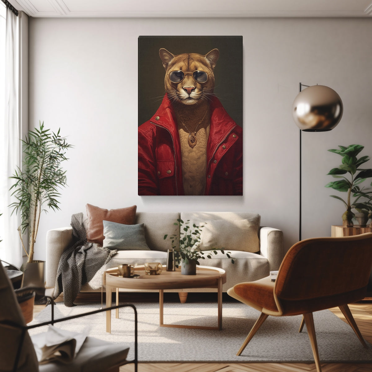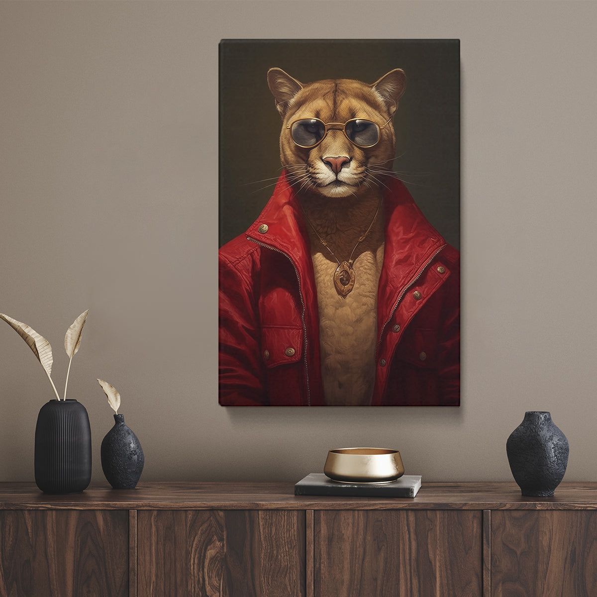 Add a funky flair to your living space with this Stylish Anthropomorphic Cougar Portrait Canvas Print. The cool cat's shades and red jacket bring a dash of bold style, ideal for a vibrant office or a trendy bedroom. Pairs well with modern and animal-themed artwork.
