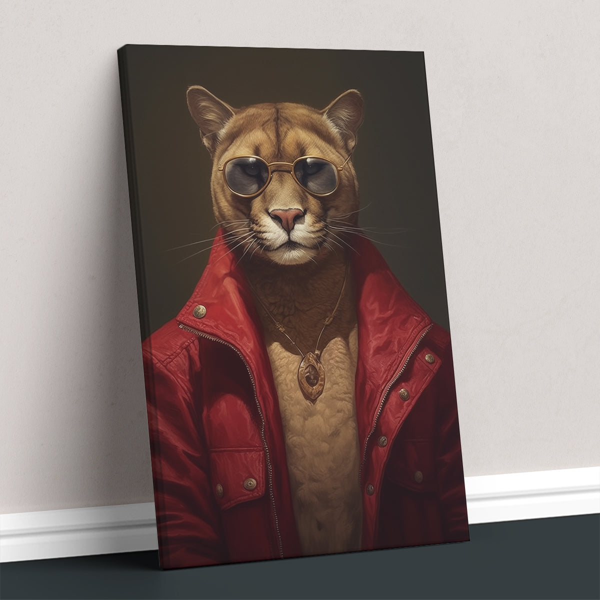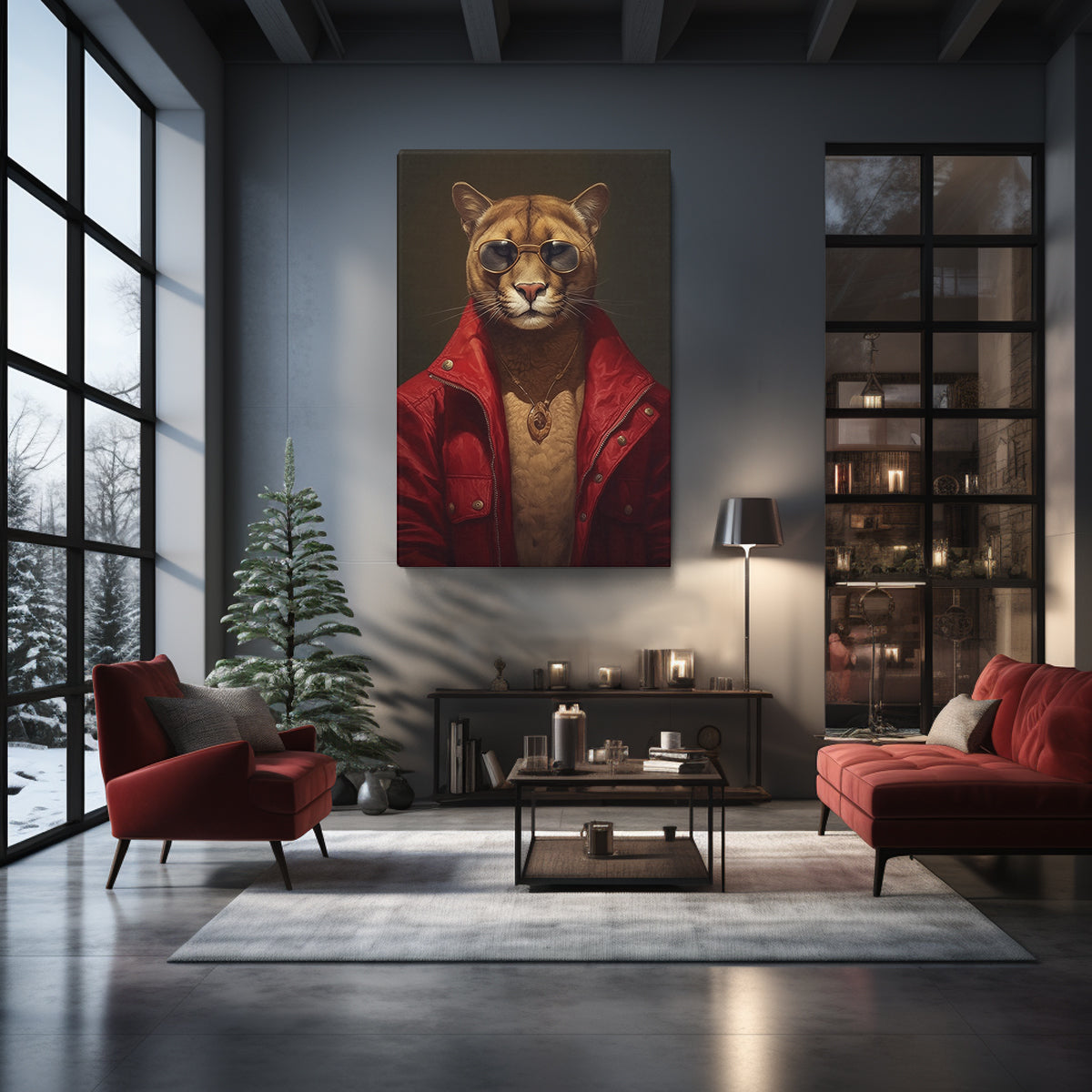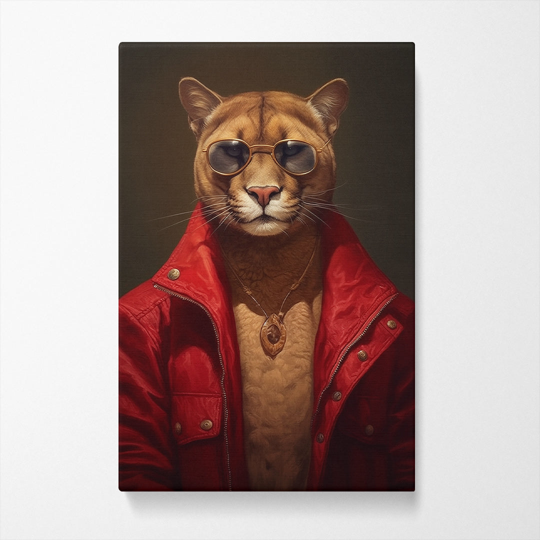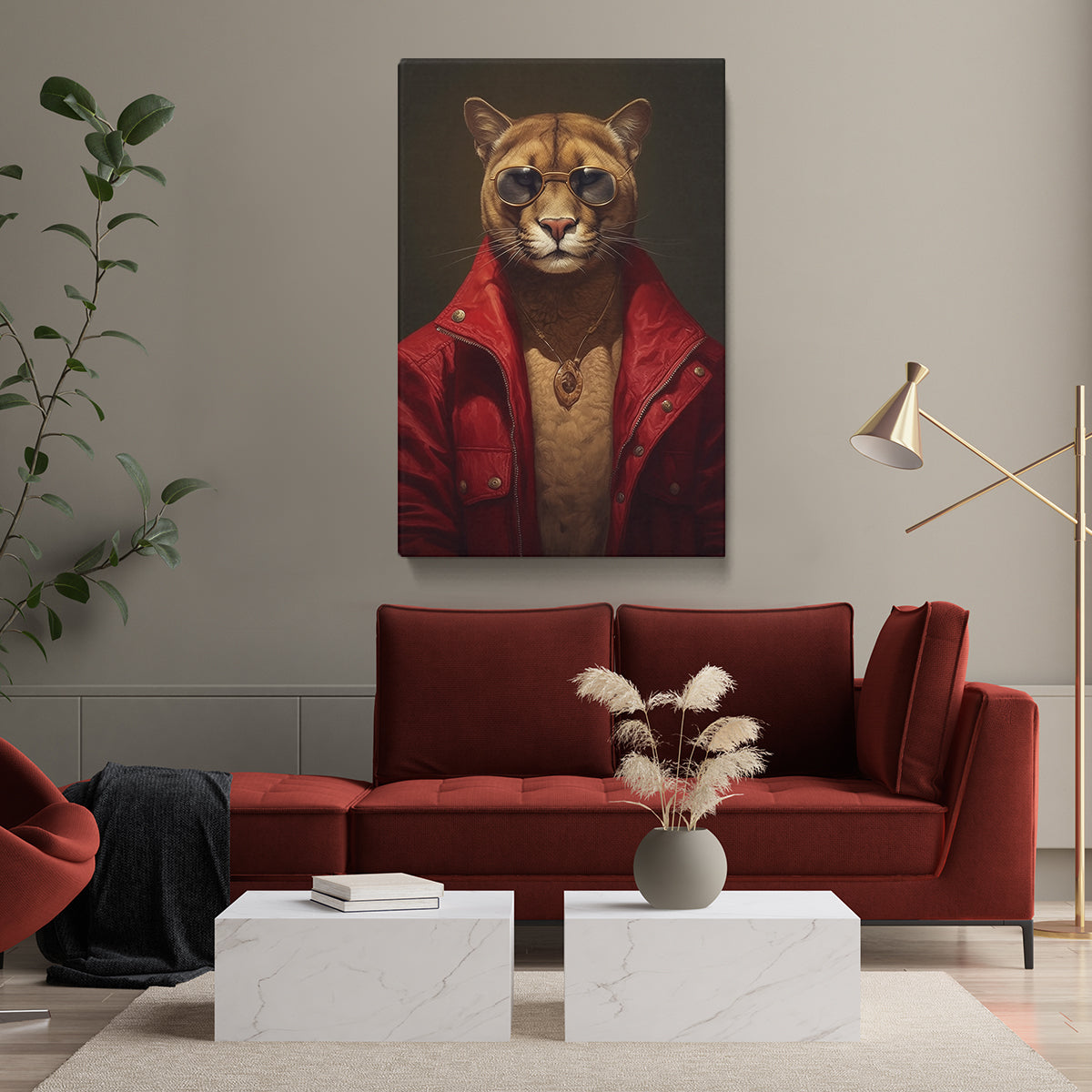 Add a funky flair to your living space with this Stylish Anthropomorphic Cougar Portrait Canvas Print. The cool cat's shades and red jacket bring a dash of bold style, ideal for a vibrant office or a trendy bedroom. Pairs well with modern and animal-themed artwork.
